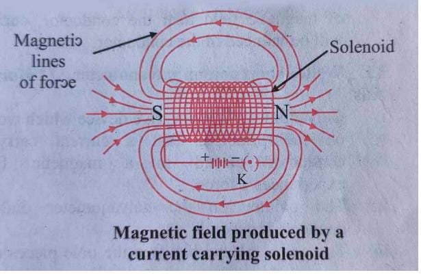 Whenever electric current passes through a solenoid, magnetic lines of force are produced in a pattern as shown in the figure.