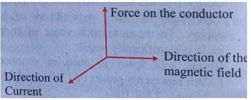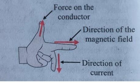 Stretch the index finger, the middle finger and the thumb of the left hand mutually perpendicular to each other. If the index finger is in the direction of the magnetic field and the middle finger points in the direction of the current, then the thumb will point towards the direction of the force on the conductor.